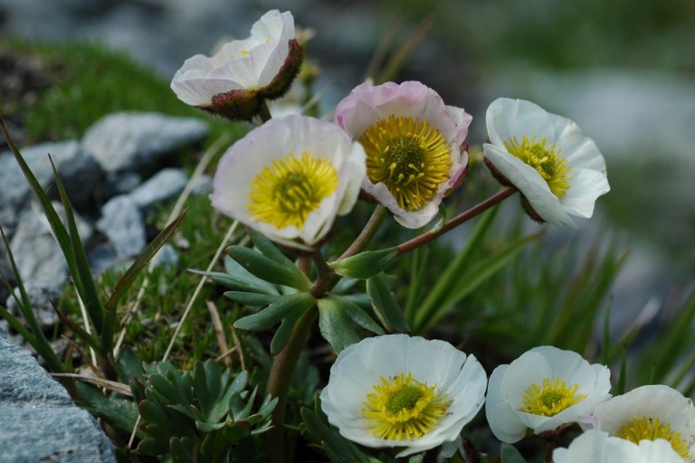 Im Gegensatz zum bekannten Gelben Hahnenfuß hat der Gletscher-Hahnenfuß zarte weiße Blüten. Diese Pflanze hat sich im Lauf der Evolution perfekt an hochalpine Schuttfluren angepasst. Mit zwiebelartig verdickten Wurzelstöcken versucht sie der Bewegung des Gerölls standzuhalten. Die Stängel, die immer wieder aus dem Schutt ragen, bilden kräftige Bündel und stabilisieren so das Geröll.