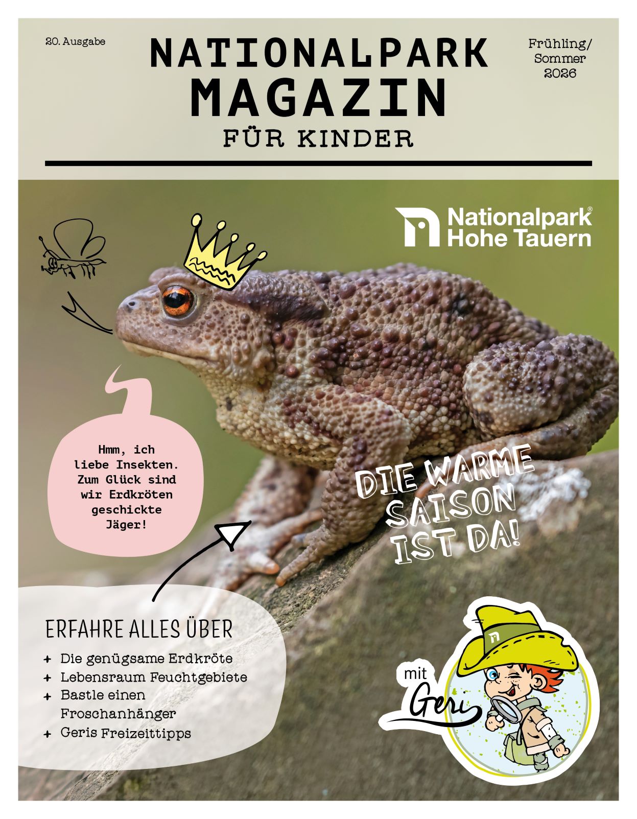 Die Frühlings- und Sommerausgabe 2026 des Nationalpark-Magazins für Kinder ist erschienen und steckt voller spannender Geschichten aus dem Nationalpark Hohe Tauern. Im Mittelpunkt steht diesmal die Erdkröte, die uns in die faszinierende Welt von Mooren, Teichen und Tümpeln führt. Dabei erfahren junge Leser:innen, warum diese besonderen Lebensräume so wertvoll und schützenswert sind.