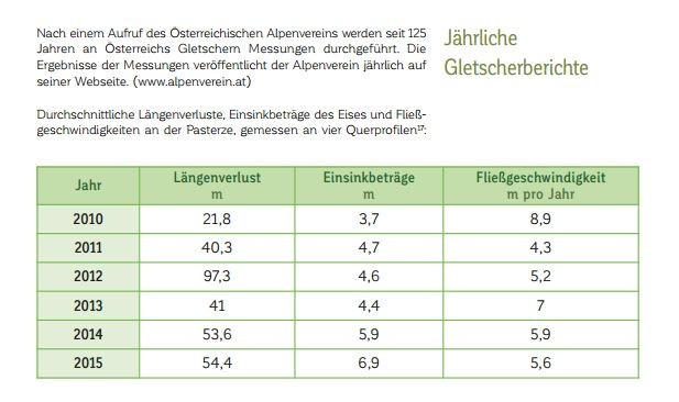 After a call for action by the Austrian Alpine Club, measurements of Austrian glaciers have been recorded for the past 125 years. The results of these measurements are published by the Austrian Alpine Club annually on its website. (www.alpenverein.at)